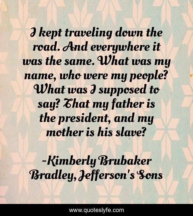 This page presents the quote "I kept traveling down the road. And everywhere it was the same. What was my name, who were my people? What was I supposed to say? That my father is the president, and my mother is his slave?". Author of this quote is Kimberly Brubaker Bradley, Jefferson's Sons. This quote is about passing, jefferson, slavery,.