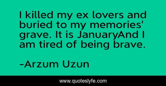 This page presents the quote "I killed my ex lovers and buried to my memories' grave. It is JanuaryAnd I am tired of being brave.". Author of this quote is Arzum Uzun. This quote is about murder, love, january, killer, lovers, grave, murderer, affection,.