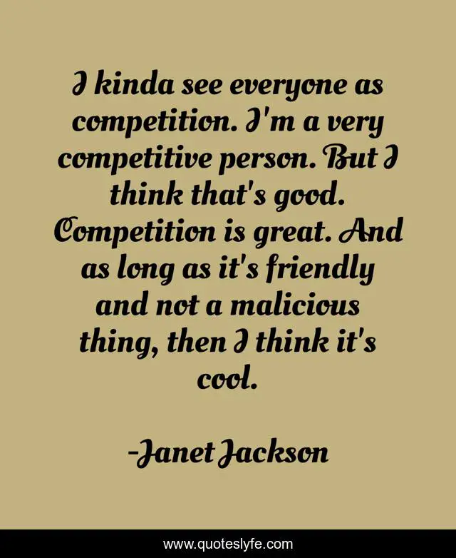 This page presents the quote "I kinda see everyone as competition. I'm a very competitive person. But I think that's good. Competition is great. And as long as it's friendly and not a malicious thing, then I think it's cool.". Author of this quote is Janet Jackson. This quote is about great, good, competition,.
