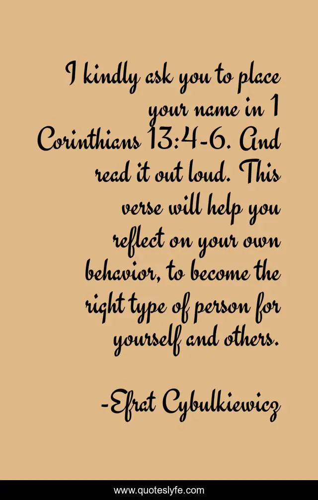 This page presents the quote "I kindly ask you to place your name in 1 Corinthians 13:4-6. And read it out loud. This verse will help you reflect on your own behavior, to become the right type of person for yourself and others.". Author of this quote is Efrat Cybulkiewicz. This quote is about spiritual-growth, self-love, self-reflection, self-awareness, self-awareness-honesty-self, self-worth, love-to-others, self-realization, self-respect,.