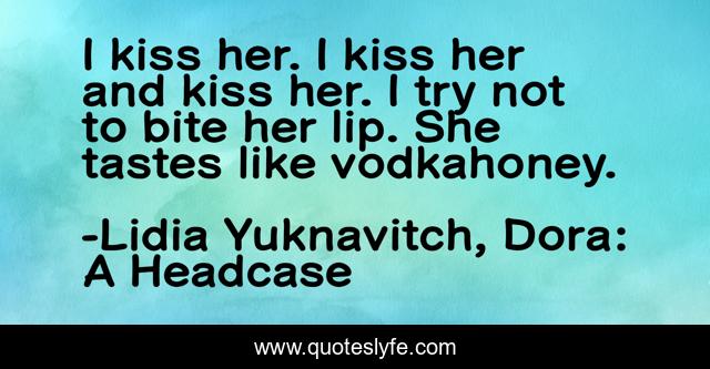 This page presents the quote "I kiss her. I kiss her and kiss her. I try not to bite her lip. She tastes like vodkahoney.". Author of this quote is Lidia Yuknavitch, Dora: A Headcase. This quote is about dora-a-headcase, lidia, hawthorne, vodka, honey, books, dora, kiss, yuknavitch,.