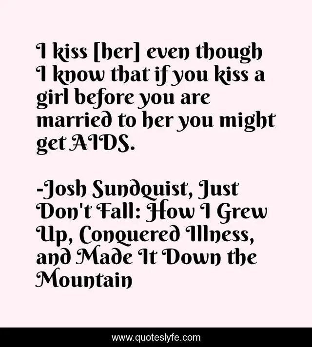 This page presents the quote "I kiss [her] even though I know that if you kiss a girl before you are married to her you might get AIDS.". Author of this quote is Josh Sundquist, Just Don't Fall: How I Grew Up, Conquered Illness, and Made It Down the Mountain. This quote is about aids, just-don-t-fall, josh-sundquist, kiss, kissing,.