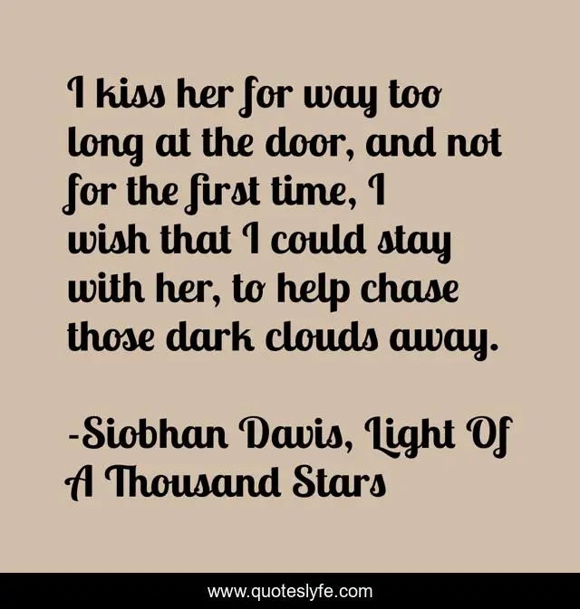 This page presents the quote "I kiss her for way too long at the door, and not for the first time, I wish that I could stay with her, to help chase those dark clouds away.". Author of this quote is Siobhan Davis, Light Of A Thousand Stars. This quote is about teen-romance, love, heartbreak, young-adult-romance-romance, affection,.