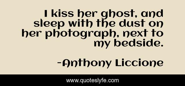 This page presents the quote "I kiss her ghost, and sleep with the dust on her photograph, next to my bedside.". Author of this quote is Anthony Liccione. This quote is about ghost, gone, photograph, death, love, relationship, missing, broken-hearted, absence,.