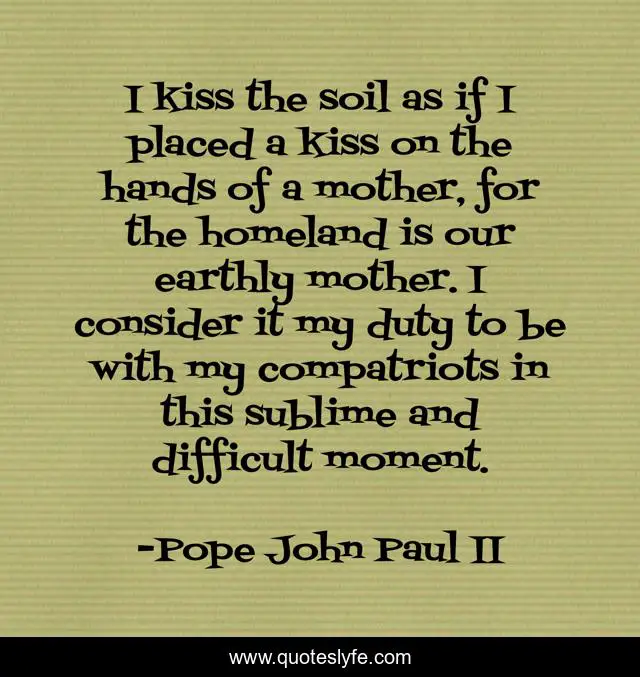 This page presents the quote "I kiss the soil as if I placed a kiss on the hands of a mother, for the homeland is our earthly mother. I consider it my duty to be with my compatriots in this sublime and difficult moment.". Author of this quote is Pope John Paul II. This quote is about moment, mother, hands,.