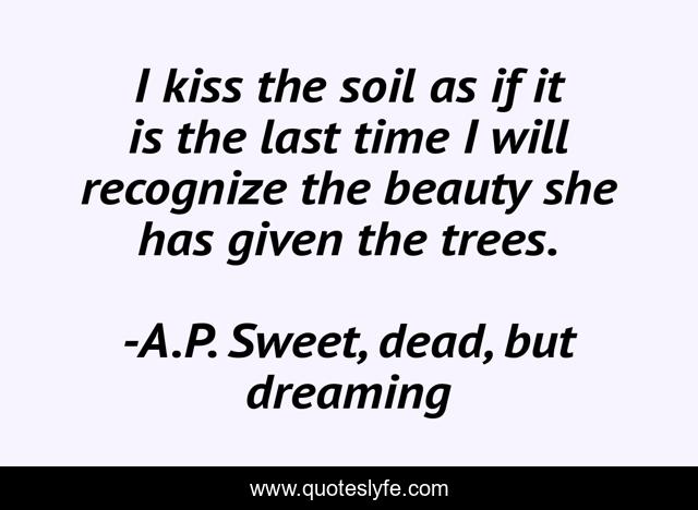 This page presents the quote "I kiss the soil as if it is the last time I will recognize the beauty she has given the trees.". Author of this quote is A.P. Sweet, dead, but dreaming. This quote is about beauty, soil, kiss, trees,.