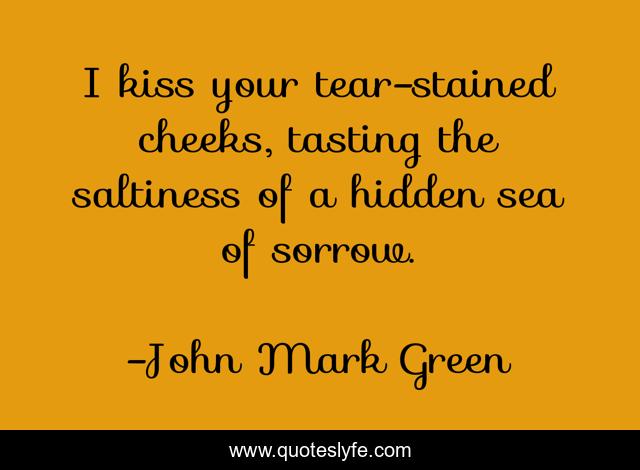 This page presents the quote "I kiss your tear-stained cheeks, tasting the saltiness of a hidden sea of sorrow.". Author of this quote is John Mark Green. This quote is about sadness-tears, sadness, sorrow,.