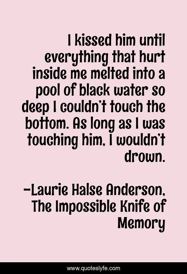 This page presents the quote "I kissed him until everything that hurt inside me melted into a pool of black water so deep I couldn’t touch the bottom. As long as I was touching him, I wouldn’t drown.". Author of this quote is Laurie Halse Anderson, The Impossible Knife of Memory. This quote is about kissing, intimacy, pain,.