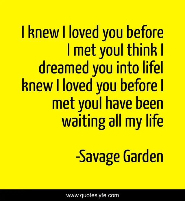 This page presents the quote "I knew I loved you before I met youI think I dreamed you into lifeI knew I loved you before I met youI have been waiting all my life". Author of this quote is Savage Garden. This quote is about devotion, love, destiny, affection,.