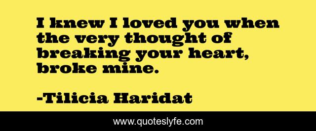 This page presents the quote "I knew I loved you when the very thought of breaking your heart, broke mine.". Author of this quote is Tilicia Haridat. This quote is about heart, heartbreak, love, commitment, affection,.