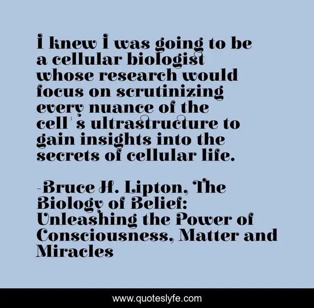 This page presents the quote "I knew I was going to be a cellular biologist whose research would focus on scrutinizing every nuance of the cell's ultrastructure to gain insights into the secrets of cellular life.". Author of this quote is Bruce H. Lipton, The Biology of Belief: Unleashing the Power of Consciousness, Matter and Miracles. This quote is about biology, research, life, knowledge,.