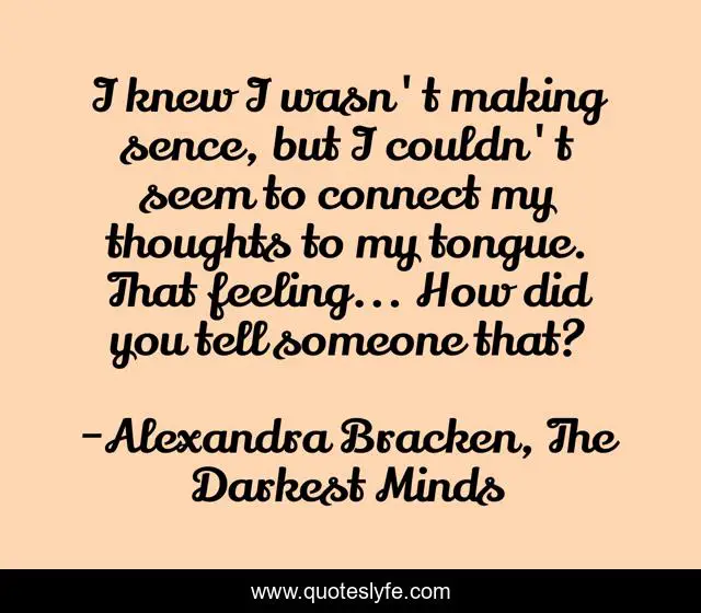 This page presents the quote "I knew I wasn't making sence, but I couldn't seem to connect my thoughts to my tongue. That feeling... How did you tell someone that?". Author of this quote is Alexandra Bracken, The Darkest Minds. This quote is about not-talking, feelings, sence,.