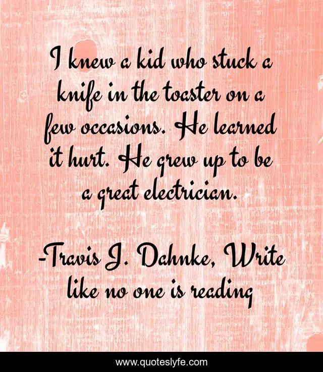 This page presents the quote "I knew a kid who stuck a knife in the toaster on a few occasions. He learned it hurt. He grew up to be a great electrician.". Author of this quote is Travis J. Dahnke, Write like no one is reading. This quote is about lessons, life, electrician, electricity, toaster, hurt, life-lessons, knife, kid,.