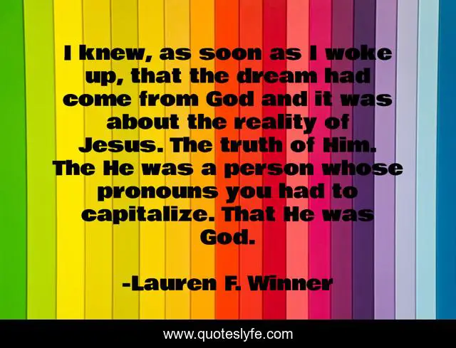 This page presents the quote "I knew, as soon as I woke up, that the dream had come from God and it was about the reality of Jesus. The truth of Him. The He was a person whose pronouns you had to capitalize. That He was God.". Author of this quote is Lauren F. Winner. This quote is about pronouns, god, jesus,.