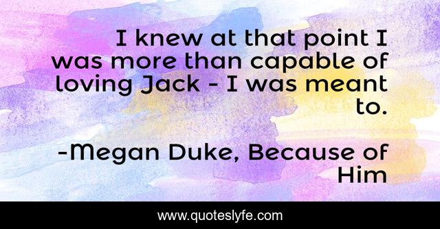 This page presents the quote "I knew at that point I was more than capable of loving Jack - I was meant to.". Author of this quote is Megan Duke, Because of Him. This quote is about love, mind-breakers, young-adult-romance, science-fiction, fantasy, young-adult-fiction, adventure, affection, young-adult-series,.