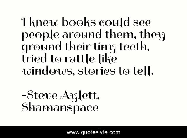 This page presents the quote "I knew books could see people around them, they ground their tiny teeth, tried to rattle like windows, stories to tell.". Author of this quote is Steve Aylett, Shamanspace. .