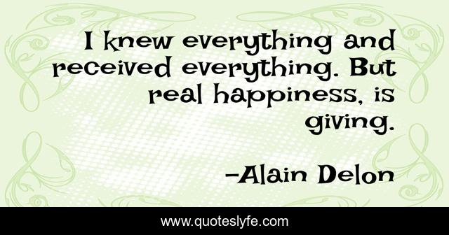 This page presents the quote "I knew everything and received everything. But real happiness, is giving.". Author of this quote is Alain Delon. This quote is about giving, real, everything,.