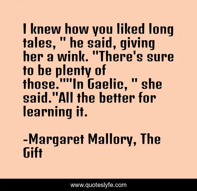 This page presents the quote "I knew how you liked long tales, " he said, giving her a wink. "There's sure to be plenty of those.""In Gaelic, " she said."All the better for learning it.". Author of this quote is Margaret Mallory, The Gift. This quote is about highlander-romance, witches, scottish-romance,.