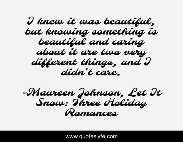 This page presents the quote "I knew it was beautiful, but knowing something is beautiful and caring about it are two very different things, and I didn't care.". Author of this quote is Maureen Johnson, Let It Snow: Three Holiday Romances. This quote is about caring-for-others, sarcasm,.