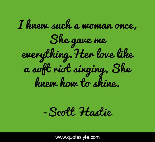 This page presents the quote "I knew such a woman once, She gave me everything.Her love like a soft riot singing, She knew how to shine.". Author of this quote is Scott Hastie. This quote is about shine, woman, love, like, how-to, singing, knew, riot, once-upon-a-time,.