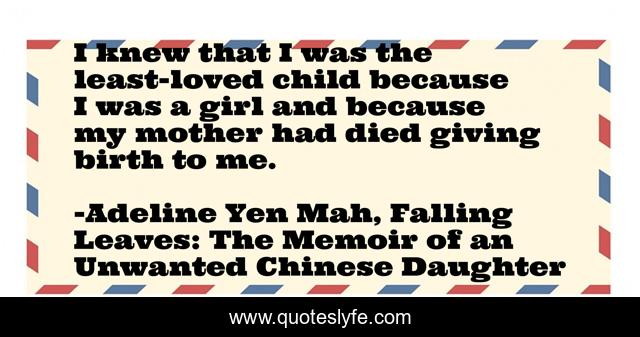 This page presents the quote "I knew that I was the least-loved child because I was a girl and because my mother had died giving birth to me.". Author of this quote is Adeline Yen Mah, Falling Leaves: The Memoir of an Unwanted Chinese Daughter. This quote is about chinese, childhood-trauma, family, abuse, memoir,.
