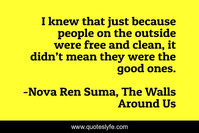 This page presents the quote "I knew that just because people on the outside were free and clean, it didn’t mean they were the good ones.". Author of this quote is Nova Ren Suma, The Walls Around Us. This quote is about good, clean, free, people,.