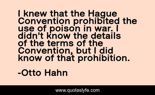 This page presents the quote "I knew that the Hague Convention prohibited the use of poison in war. I didn't know the details of the terms of the Convention, but I did know of that prohibition.". Author of this quote is Otto Hahn. This quote is about details, poison,.