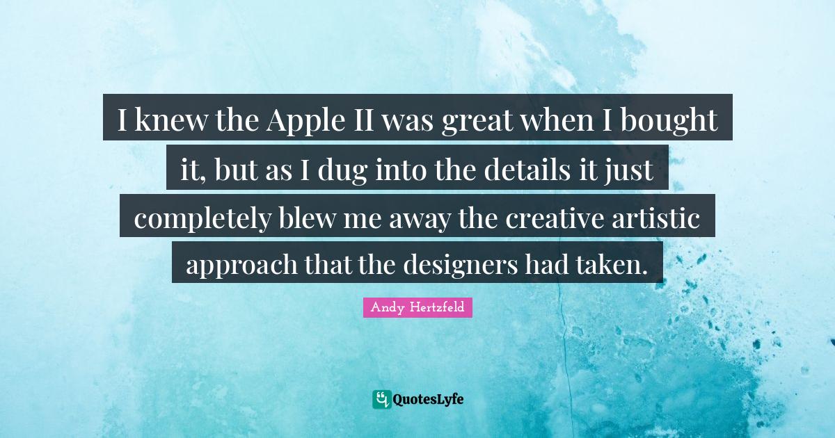 This page presents the quote "I knew the Apple II was great when I bought it, but as I dug into the details it just completely blew me away the creative artistic approach that the designers had taken.". Author of this quote is Andy Hertzfeld. This quote is about creative, artistic, apples, taken, approach, details,.
