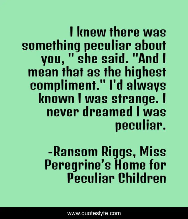 This page presents the quote "I knew there was something peculiar about you, " she said. "And I mean that as the highest compliment." I'd always known I was strange. I never dreamed I was peculiar.". Author of this quote is Ransom Riggs, Miss Peregrine’s Home for Peculiar Children. This quote is about humorous, backhanded-compliment, embrace-who-you-are, embrace-who-we-are, oddballs,.