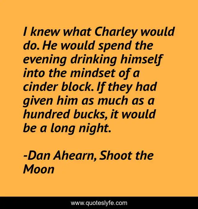This page presents the quote "I knew what Charley would do. He would spend the evening drinking himself into the mindset of a cinder block. If they had given him as much as a hundred bucks, it would be a long night.". Author of this quote is Dan Ahearn, Shoot the Moon. This quote is about drinking, humor, drunkenness,.