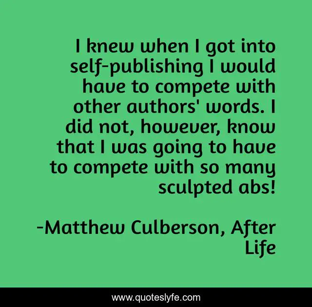 This page presents the quote "I knew when I got into self-publishing I would have to compete with other authors' words. I did not, however, know that I was going to have to compete with so many sculpted abs!". Author of this quote is Matthew Culberson, After Life. This quote is about fiction, abs, kdp, covers, self-publishing,.