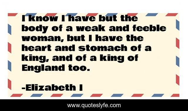 This page presents the quote "I know I have but the body of a weak and feeble woman, but I have the heart and stomach of a king, and of a king of England too.". Author of this quote is Elizabeth I. This quote is about strength, england, men, royalty, kings, queens, women,.