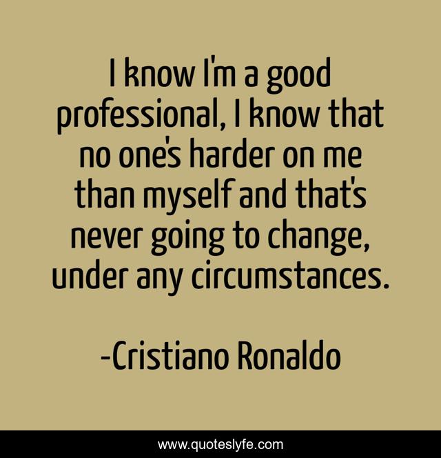 This page presents the quote "I know I'm a good professional, I know that no one's harder on me than myself and that's never going to change, under any circumstances.". Author of this quote is Cristiano Ronaldo. This quote is about me, myself, good,.
