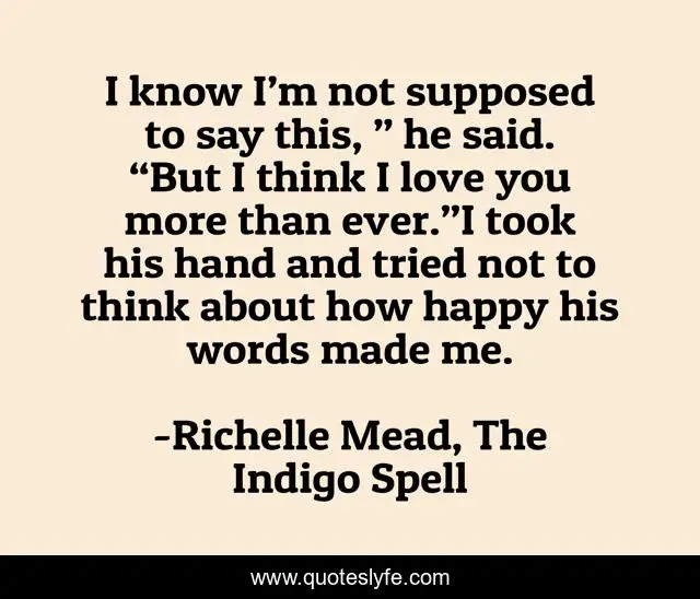 This page presents the quote "I know I’m not supposed to say this, ” he said. “But I think I love you more than ever.”I took his hand and tried not to think about how happy his words made me.". Author of this quote is Richelle Mead, The Indigo Spell. This quote is about adrian-ivashkov, love, sydney-sage, affection, feelings,.