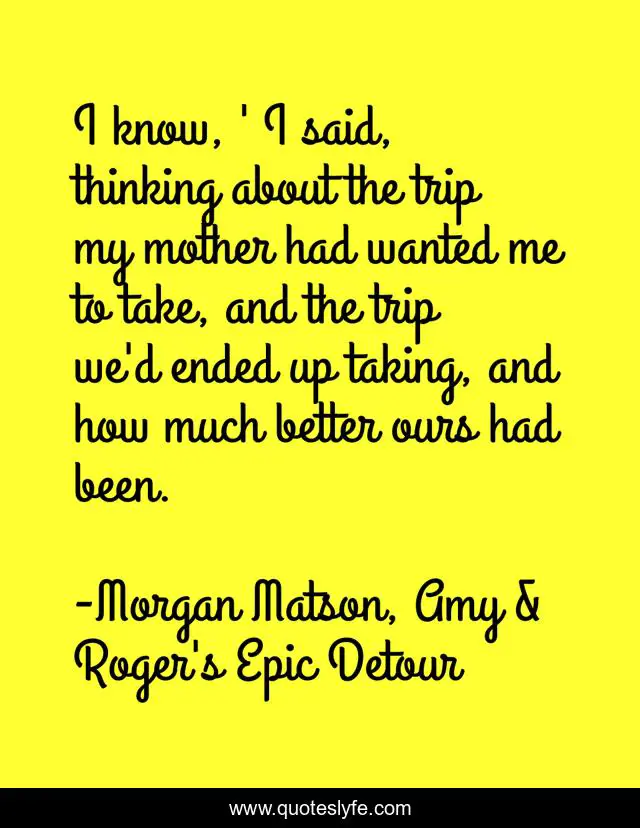 This page presents the quote "I know, ' I said, thinking about the trip my mother had wanted me to take, and the trip we'd ended up taking, and how much better ours had been.". Author of this quote is Morgan Matson, Amy & Roger's Epic Detour. This quote is about summer, amy-and-roger-s-epic-detour, road-trip, summer-road-trip, trip,.