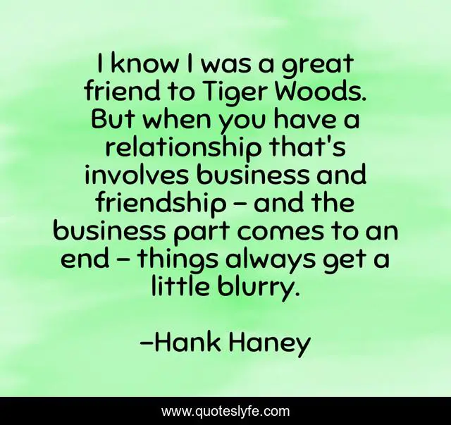 This page presents the quote "I know I was a great friend to Tiger Woods. But when you have a relationship that's involves business and friendship - and the business part comes to an end - things always get a little blurry.". Author of this quote is Hank Haney. This quote is about business, relationship,.