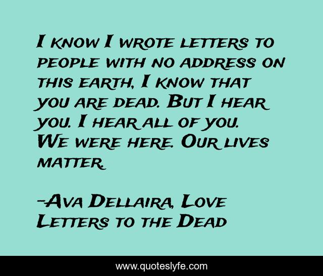 This page presents the quote "I know I wrote letters to people with no address on this earth, I know that you are dead. But I hear you. I hear all of you. We were here. Our lives matter.". Author of this quote is Ava Dellaira, Love Letters to the Dead. This quote is about life, death,.
