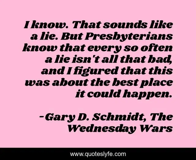 This page presents the quote "I know. That sounds like a lie. But Presbyterians know that every so often a lie isn't all that bad, and I figured that this was about the best place it could happen.". Author of this quote is Gary D. Schmidt, The Wednesday Wars. This quote is about lies, christian-behavior, humor,.