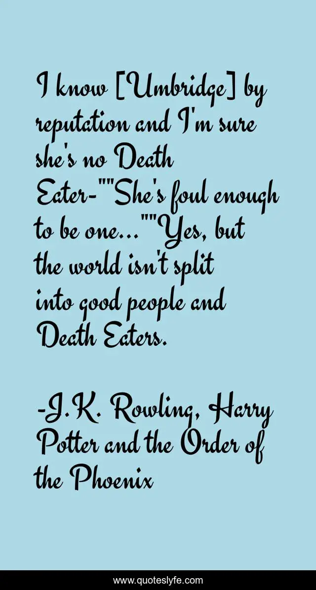 This page presents the quote "I know [Umbridge] by reputation and I'm sure she's no Death Eater-""She's foul enough to be one...""Yes, but the world isn't split into good people and Death Eaters.". Author of this quote is J.K. Rowling, Harry Potter and the Order of the Phoenix. This quote is about sirius-black, good, harry-potter, death-eaters, umbridge, evil, dolores-umbridge,.