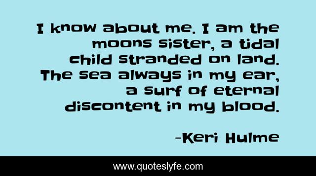 This page presents the quote "I know about me. I am the moons sister, a tidal child stranded on land. The sea always in my ear, a surf of eternal discontent in my blood.". Author of this quote is Keri Hulme. This quote is about discontent, self, sea, ocean,.