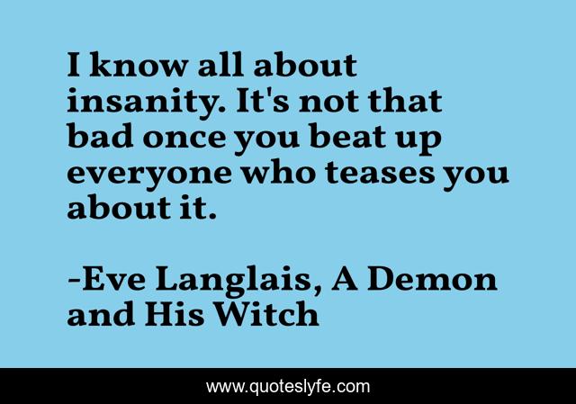This page presents the quote "I know all about insanity. It's not that bad once you beat up everyone who teases you about it.". Author of this quote is Eve Langlais, A Demon and His Witch. This quote is about crazy, humor, insanity,.