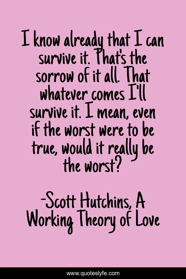 This page presents the quote "I know already that I can survive it. That's the sorrow of it all. That whatever comes I'll survive it. I mean, even if the worst were to be true, would it really be the worst?". Author of this quote is Scott Hutchins, A Working Theory of Love. This quote is about grief, pain, healing,.