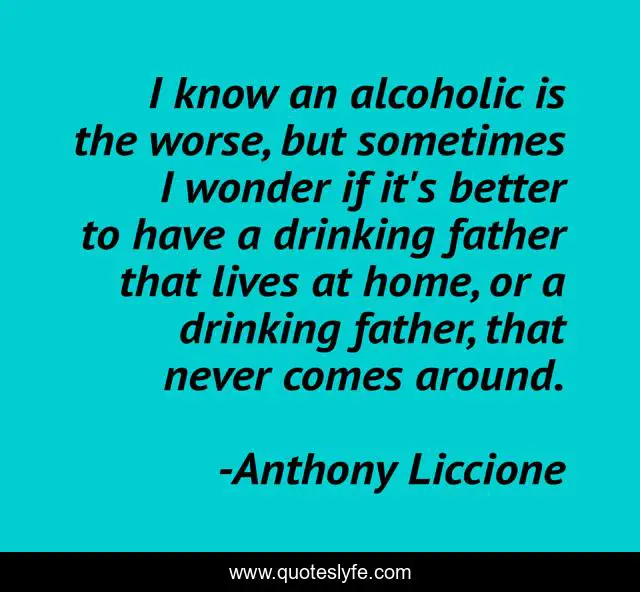 This page presents the quote "I know an alcoholic is the worse, but sometimes I wonder if it's better to have a drinking father that lives at home, or a drinking father, that never comes around.". Author of this quote is Anthony Liccione. This quote is about gone, acceptance, family, alcoholic, fatherly-figure, inattentive, unknown, dead-beat, distracted,.