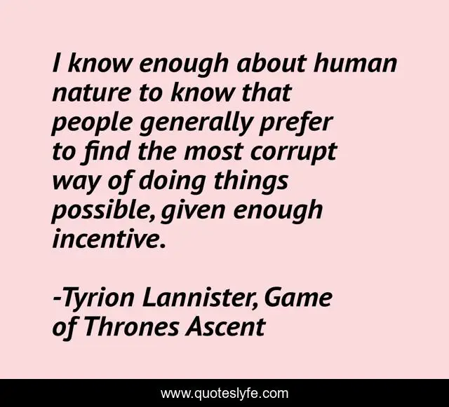 This page presents the quote "I know enough about human nature to know that people generally prefer to find the most corrupt way of doing things possible, given enough incentive.". Author of this quote is Tyrion Lannister, Game of Thrones Ascent. This quote is about human-nature, game-of-thrones,.