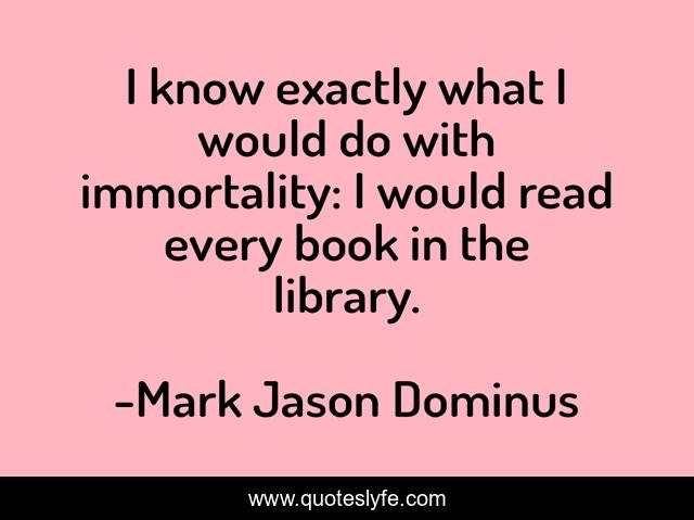 This page presents the quote "I know exactly what I would do with immortality: I would read every book in the library.". Author of this quote is Mark Jason Dominus. This quote is about immortality, books, reading, library,.