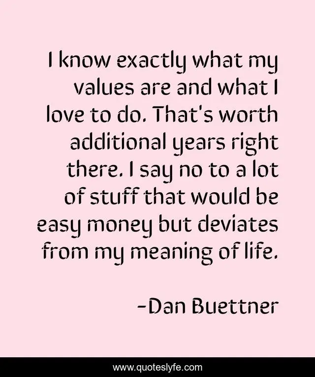 This page presents the quote "I know exactly what my values are and what I love to do. That's worth additional years right there. I say no to a lot of stuff that would be easy money but deviates from my meaning of life.". Author of this quote is Dan Buettner. This quote is about life, love, easy, affection,.