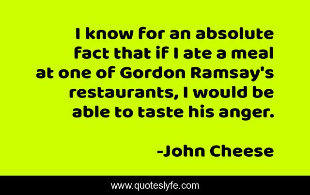 This page presents the quote "I know for an absolute fact that if I ate a meal at one of Gordon Ramsay's restaurants, I would be able to taste his anger.". Author of this quote is John Cheese. This quote is about food, gordon-ramsay, angry-chef,.