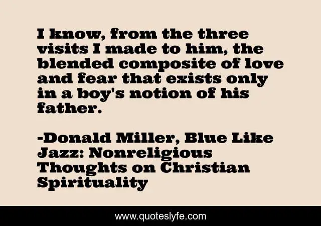 This page presents the quote "I know, from the three visits I made to him, the blended composite of love and fear that exists only in a boy's notion of his father.". Author of this quote is Donald Miller, Blue Like Jazz: Nonreligious Thoughts on Christian Spirituality. This quote is about fear, boyhood, love, fatherhood, affection,.