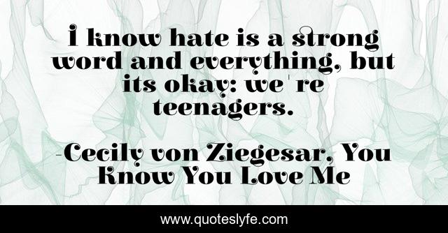 This page presents the quote "I know hate is a strong word and everything, but its okay: we're teenagers.". Author of this quote is Cecily von Ziegesar, You Know You Love Me. This quote is about teen, hate,.