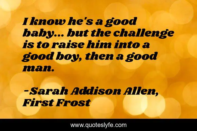This page presents the quote "I know he's a good baby... but the challenge is to raise him into a good boy, then a good man.". Author of this quote is Sarah Addison Allen, First Frost. This quote is about parenting, raising-children,.